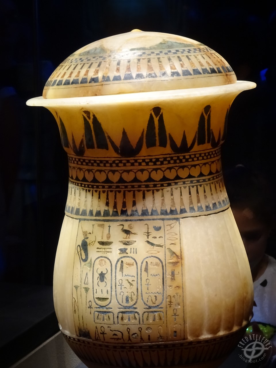 Si le masque fameux est resté au Caire (j'aurais été très déçu si je ne l'avais pas vu quand j'ai visité ce musée), plusieurs représentations fameuses de Toutankhamon ont fait le voyage, dont cette tête en albâtre et ce sarcophage miniature.