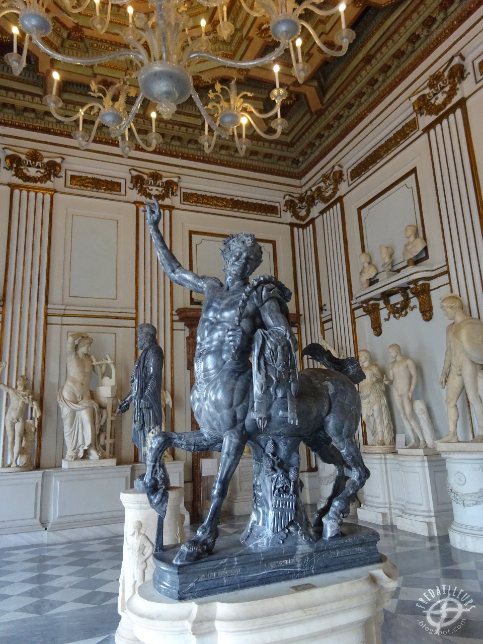 Le marbre gris pouvait être pris, de loin, pour du bronze. Ici il a servi à d'exceptionnelles statues, dont les remarquables centaures.