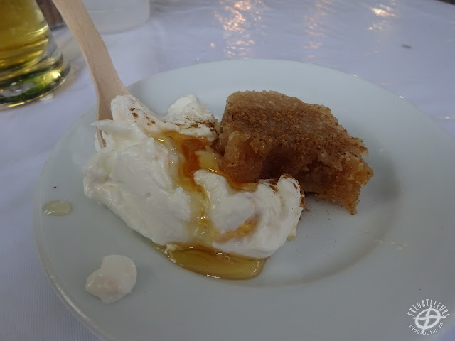 Sans que je l'aie commandé, le serveur m'apporte un dessert offert par la maison, un gâteau de semoule avec du yaourt onctueux et du miel. Bien savoureux tout ça.