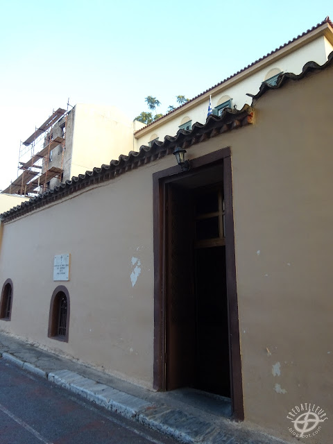 Que voilà un bien élégant édicule. Le panonceau m'informe qu'il s'agit du monument chorégique de Lysiskrates. Construit au IVe siècle avant J.C., il est orné de scènes de la vie de Dyonisos. Il est toujours situé dans la rue des Tripodes, qui reliait autrefois l'ancienne agora avec le théâtre de Dyonisos. Si je comprends bien, les choregoi en question étaient des mécènes de la ville et ils reçurent des prix pour leur victoire dans des concours de dithyrambes (des hymnes religieux mis en scène en l'honneur de Dionysos, pour simplifier). En gros, c'est le producteur qui reçoit un prix pour le "spectacle" (terme sans doute inconvenant) qu'il a monté.