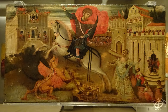 Saint Georges avec le dragon et la princesse de Trébizonde. Ce n'est pas le chef-d'oeuvre de Pisanello à Vérone mais une belle peinture où l'architecture est décrite avec précision.